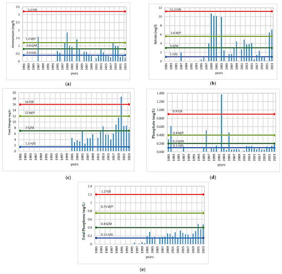 The nutrient regimen of Nuntași-Tuzla Lake is determined based on the following indicators: ammonium (NH4+) [mg/L], nitrate (NO3−) [mg/L], total nitrogen (N) [mg/L], phosphate (PO43−) [mg/L], and total phosphorous (P) [mg/L] (Figure 7). The nutrient classification according to OM161/2006 is presented in Table 4.