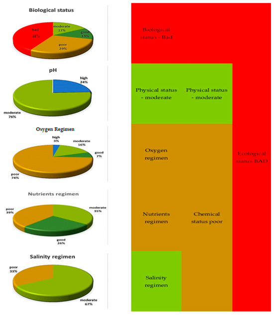 The general principle for establishing the ecological status of water surfaces stipulated in Appendix 5 of the WFD is “one out–all out”, which means that the most unfavorable situation is selected.