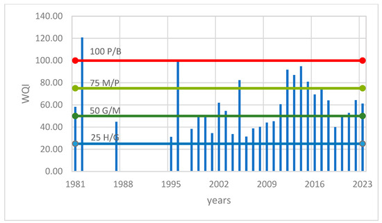 Figure 10 shows that only in 1982, the WQI was greater than 100, which means “bad” conditions. Otherwise, out of 31 WQI values, 39% represent “good” conditions, 35% represent “moderate” conditions, and 23% represent “poor” conditions. It should be remembered that the series representing the salinity indicators is for the period 1981–2009 (with the gaps already indicated) and the one relating to the biological elements is for the period 2010–2023.