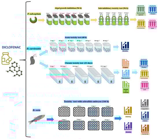 Outline of the procedures applied in the evaluation of the toxic effects of diclofenac in microalgae, cladocerans, and fish.