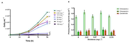 Figure 2B shows the quantification of chlorophyll-a, -b, and carotenoids for each of the tested concentrations of diclofenac. In the case of chlorophyll-a, increases of 38.3 and 36.6% were found at concentrations of 3.62 and 7.6 mg L−1, respectively; however, no significant differences were determined compared to the control.