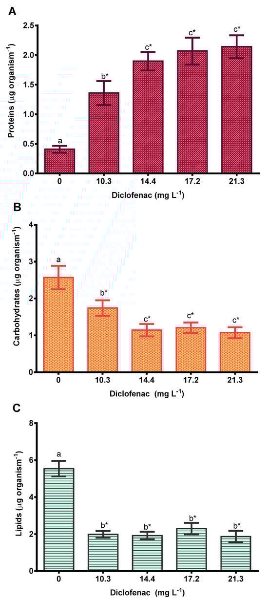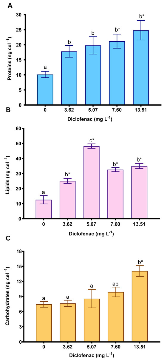 Biomarkers in cells of P. subcapitata exposed to subinhibitory concentrations of diclofenac during 96 h: (A) proteins, (B) lipids and (C) carbohydrates. Mean values ± standard error. The asterisks indicate significant differences compared with the control (Dunnett’s test, p < 0.05). Different letters above the bars indicate significant differences (Tukey’s pairwise comparisons, p < 0.05).