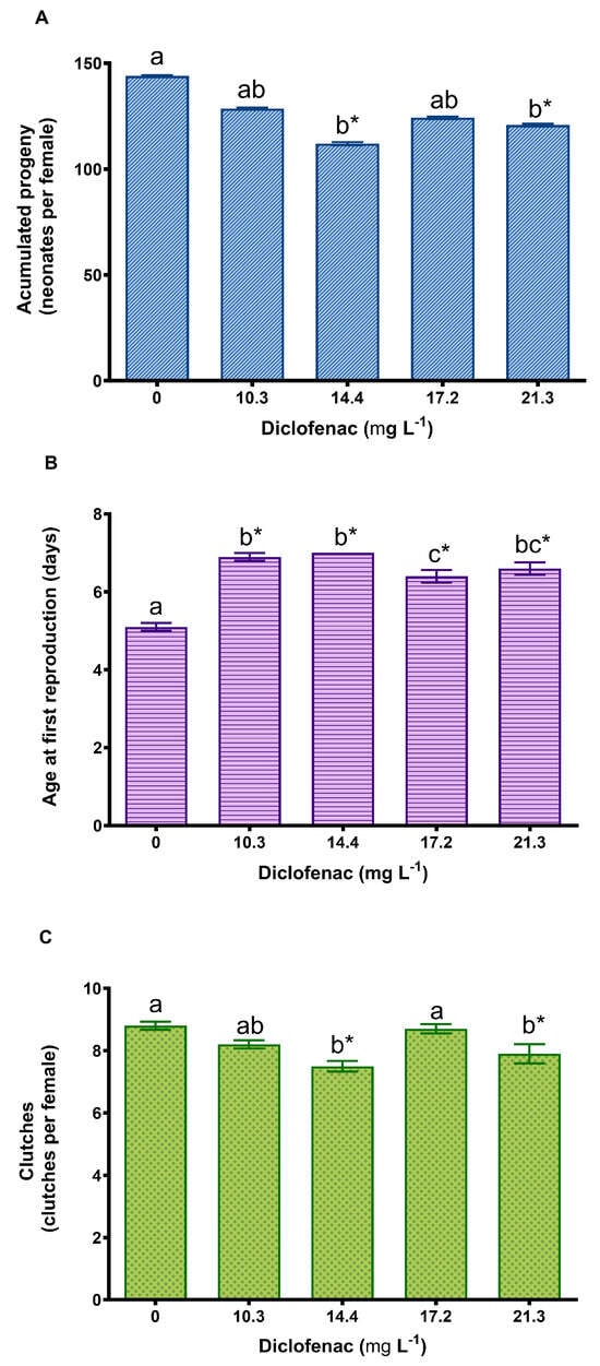 Effect of diclofenac on Daphnia curvirostris after exposure for 21 days: (A) accumulated progeny, (B) age at first reproduction, and (C) number of clutches. Mean values ± standard error. The asterisk indicates significant differences from the control (Dunnett’s test, p < 0.05). Different letters above the bars indicate significant differences (Tukey’s pairwise comparisons, p < 0.05).