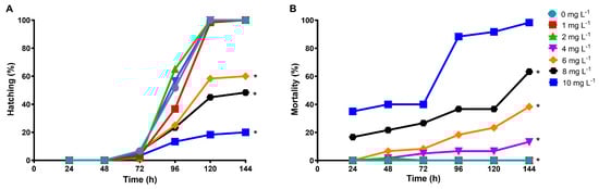 Effect of diclofenac on embryos of Danio rerio after 144 h of exposure: (A) hatching; (B) mortality. The asterisks indicate differences compared with the control (Kruskal–Wallis test).
