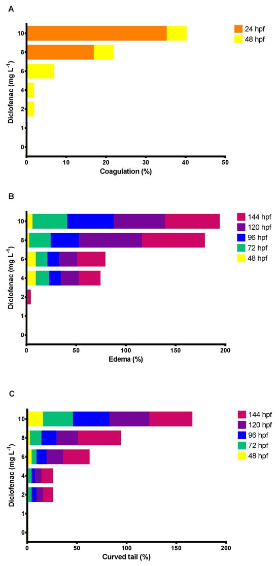 Figure 6A shows that the hatching rate of D. rerio embryos decreased by 40, 51.6, and 80% at concentrations of 6, 8, and 10 mg L−1 of diclofenac, respectively, compared with the control. In contrast, the mortality of embryos and larvae increased as the concentration of diclofenac and the exposure time increased (Figure 6B). The determined LC50 of diclofenac in zebrafish embryos was 6.27 mg L−1 (confidence limits: 4.72 to 7.91 mg L−1). Diclofenac caused lethal effects in embryos, such as coagulation at 24 and 48 h exposure. Figure 7A shows that the percentage of coagulation of embryos was more significant at 24 h (16.6 and 35%, at 8 and 10 mg L−1 of diclofenac, respectively) than at 48 h. In addition, sublethal effects, such as edema and curved tails, were observed in D. rerio embryos at nearly all tested drug concentrations from 48 to 144 hpf. Figure 7B,C shows that the adverse effects of diclofenac (edema and curved tail) in D. rerio embryos increased as the concentration of the drug and the exposure time increased.