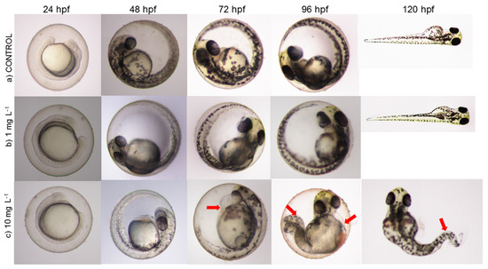 Toxic effects of diclofenac on the development of zebrafish embryos after 120 h exposure. (a) Normal embryo and larva in the control; (b) normal embryo and larva in 1 mg L−1 of diclofenac; (c) exposure to 10 mg L−1 produced edema in the embryo at 72 and 96 hpf, and curved tail in the 120 hpf larva. The red arrows in the figure indicate sublethal effects.