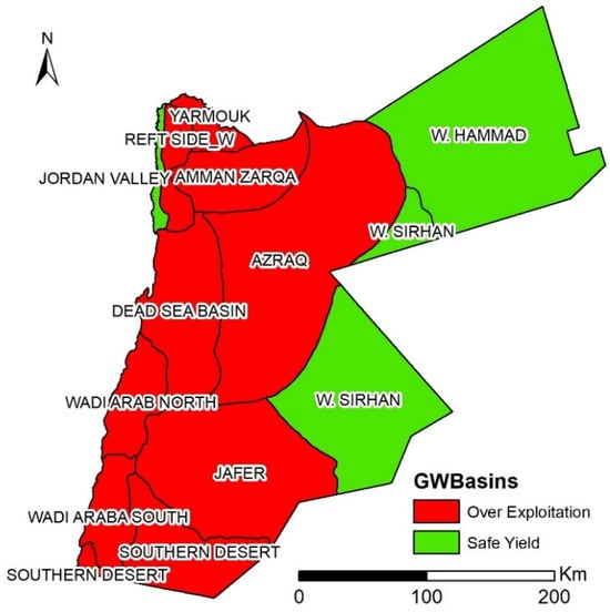 Groundwater basins in Jordan classified by the sustainability of extraction.