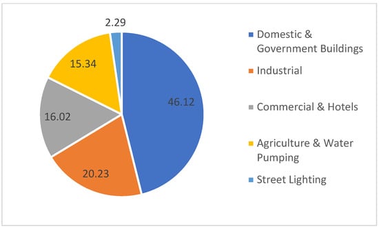 Agriculture and water pumping constituted 15.34% of Jordan’s total energy consumption in 2018 (Figure 3). The Water Authority of Jordan is the largest electricity consumer in the country, and the water sector will need to depend on a robust energy sector to support achieving water efficiency in its domestic sector [29]. Groundwater is the principal source of Jordan’s entire water supply. Strategically implementing energy and water allocation policies together will produce greater advances in sustainability and equity of groundwater delivery compared to an alternative in which both sectors are managed separately [30].