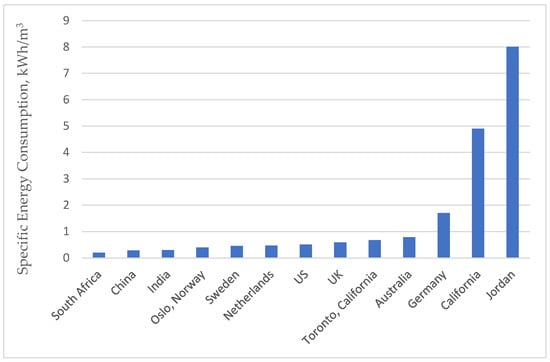Jordan relies heavily on imports to cover its energy demand. Jordan’s energy demand was 7.58 mega tons of oil equivalent (Mtoe) in 2007, and this demand increased to 15.08 Mtoe in 2020 [27]. In addition to its overall consumption of electricity, the activities along the value chain of Jordan’s water sector are also highly energy-intensive. Additionally, the steep elevation across the country add to the energy needs of the water conveyance system [31]. The specific energy consumption for water pumping in 2015 was approximately 8.01 kWh/m3, considerably higher than the requirements of other nations [32] (see Figure 4).