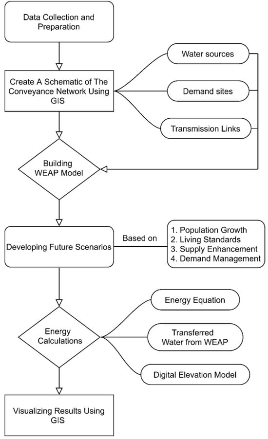 Framework for integrated water and energy planning using GIS (ArcMap 10.2) and WEAP 2019.202 software.
