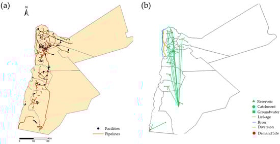 (a) Jordan’s main water conveyance network; (b) WEAP schematic of the conveyance network.