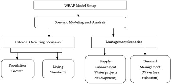 Jordan’s water supply situation is exposed to numerous demand-side and supply-side constraints: population growth and rising living standards will continue to raise the demand for water while new infrastructure projects and improving water efficiency can increase the water available to meet demand. Each of these factors can take on different values and magnitudes in the future, and we develop five scenarios examining their impact on the energy requirements of the main water conveyance system under different combinations of these values. We investigate the future energy consumption of Jordan’s conveyance network according to four factors: population growth (high or moderate), living standards (high or low), as well as water development projects and water loss reduction whose magnitude is modeled as a binary value: either Jordan develops new water projects or not; either water loss is reduced or not. The simulated reduction in non-revenue water for future management scenarios followed the parameters stated in Jordan’s National Water Strategy 2016–2025 such that water loss will be reduced gradually from 52% to 30% within 10 years [35]. The model incorporates dynamic population growth rates and applies projections up to 2050 considering high (2.3%) and moderate (1.4%) growth scenarios based on national planning figures [24]. Per capita water use is aimed to be equally distributed across the country with 120 L/c/d available in Amman while the other governorates receive 100 L/c/d [24,35]. Our modeling procedures do not directly incorporate climate variability, temperature variability, or rainfall uncertainty due to data limitations and the scope of this study (see Figure 7).