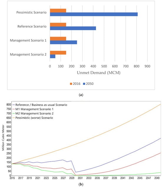 The change in the consumption of energy during the study period in the three developed scenarios is shown in Figure 19. The energy consumption for the reference scenario for the network increases gradually from 1496.7 GWh in 2015 to reach 3171.6 GWh by 2050 (see Figure 19). Referring to management scenario 1, the increase reaches 3182.3 GWh in 2050. Looking at the period from 2015 to 2020, there is no significant increase in the consumption in all scenarios. This is due to the lack of water sources, which means there is less water available to be transferred by the network, resulting in high unmet demand, as illustrated by Figure 14b. New projects completed by 2030 provide more water supply, which leads to a precipitous decline in unmet water demand (Figure 14b) but has the simultaneous effect of raising the energy consumption of the system.