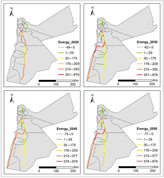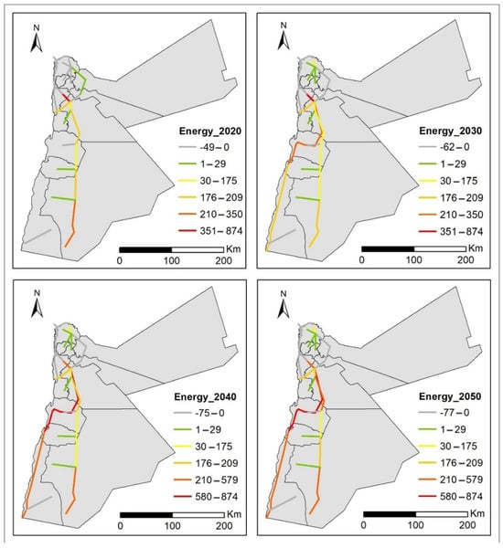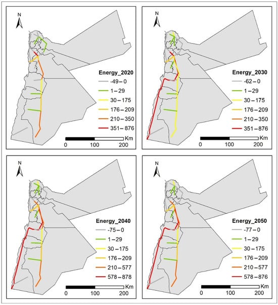 Under the management scenarios modeled in this study, conveyance energy demand is projected to double by 2050 if current practices continue. This surplus energy requirement places significant pressure on Jordan’s national electricity grid, which is already strained and heavily reliant on imported fossil fuels. Increased water-related electricity consumption may lead to trade-offs with other critical sectors, including health, industry, and education—especially during peak demand periods—or fuel supply interruptions. climate risks is projected to decrease average annual rainfall 15% to 20% by 2050, while temperatures may rise by 1.5–2.5 °C, increasing both water scarcity and evaporation losses [49,50]. Such shifts would likely increase the energy needed for water conveyance due to reduced gravity-fed options and a greater dependence on pumped sources. As a result, future planning should integrate climate-resilient infrastructure design and renewable energy expansion to buffer against these compounded risks. Our findings suggest that Jordan pursue a variety of actional policy steps to address these challenges: