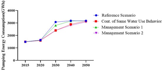 The developed scenarios showed different high energy consumption amounts based on the transferred water; however, the energy requirements are constrained by the scarcity of water in all scenarios. According to all scenarios, the energy consumption is expected to double by the year 2050 and reach more than 3170 GWh. However, the “Continue with the Same Water Use Behavior” scenario offers less total energy consumption through the study period, as compared to the reference and management scenario 1. It does not distribute the water equitably, as most governorates have low living standards in terms of the water use. Management scenario 2 represents the ideal scenario in terms of the water distribution and energy consumption. Yet, implementing this scenario requires significant efforts and resources to apply the proposed management options.