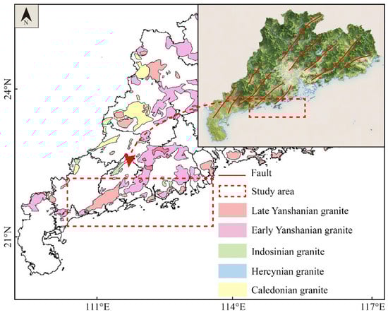 In the study area, geothermal groundwater is predominantly localized at the intersection zones of fault networks. Tectonically, the region is situated at a triple junction where the Eurasian Plate, Pacific Plate, and Philippine Sea Plate interact. Several violent tectonic movements and multi-stage magma intrusions cause a series of deep faults and nearby secondary faults. The main tectonic activities occur in the Caledonian, the Indosinian, and the Yanshan–Himalayan [25]. Under the superimposed influence of several geological processes, a series of N-NE and N-NW trending faults are developed. As permeation and runoff channels, the existence of fault structure plays a vital role in the recharge and discharge of geothermal resources. In the study area, geothermal activity is predominantly associated with two distinct structural orientations. NNE- to NE-trending fault systems are interpreted as thermally dominant structures, primarily controlling the distribution and localization of heat sources within the subsurface [26]. In contrast, NW-oriented fault systems are considered to function as conductive pathways, facilitating both heat transfer and fluid migration. These structural orientations likely reflect differential stress regimes and tectonic histories, with NW-trending faults potentially representing reactivated shear zones that enhance permeability and hydraulic connectivity.