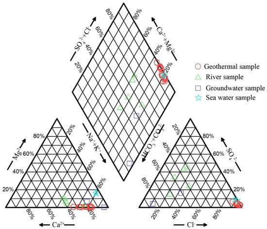 Geothermal groundwater samples exhibited a wide range of total dissolved solid (TDS) values, spanning 564 mg/L to 9861 mg/L, with a mean value of 4451 mg/L. The pH value of these samples ranged between 7.00 and 8.30, indicating a predominantly neutral-to-alkaline environment. Regarding the ionic composition, the major cations in the geothermal groundwater were present in the order of Na+ > Ca2+ > K+ > Mg2+, while the anions followed the sequence of Cl− >SO42− > HCO3−. The geothermal groundwater was characterized by a Cl-Na type (Figure 2). As summarized in Table 1, the coefficient of variation (CV) for Na+, Ca2+, Mg2+, Cl−, SO42−, and HCO3− displayed substantial variability, which underscores the complexity and diversity of the hydrochemical factors influencing the characteristics of geothermal groundwater. Additionally, the fluoride (F−) concentrations in the samples ranged from 3 to 12 mg/L, with an average of 4.7 mg/L. Given that all samples possessed F− concentrations higher than 1.0 mg/L, they can be classified as fluoride-enriched geothermal groundwater.