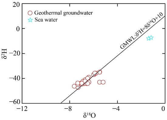Stable isotope signatures serve as critical tracers in elucidating the provenance, residence time, and hydrogeochemical evolution of groundwater. As summarized in Table 1, the analyzed samples exhibited distinct isotopic fingerprints between geothermal groundwater and sea water. The geothermal waters demonstrated relatively depleted isotopic compositions, with δD values ranging between −47.0‰ and −35.0‰ (average value of −41.0‰), coupled with δ1⁸O values ranging from −8.2‰ to −5.1‰ (average value of −6.5‰). In contrast, sea waters displayed significantly enriched signatures, characterized by δD and δ1⁸O values varying from −17.3‰ to −7.9‰, and −5.2‰ to −1.4‰, respectively. The isotopic distribution patterns presented in Figure 3 provide critical insights into hydrological recharge processes. All samples plot along the Global Meteoric Water Line (GMWL: δD = 8δ1⁸O + 10). In addition, few geothermal groundwater samples display systematic isotopic deviations characterized by rightward shifts below the GMWL, indicative of oxygen isotope exchange associated with water–rock interactions.