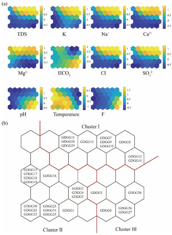 In this study, a dataset of 30 geothermal groundwater samples was analyzed. The dataset included measurements of 11 different hydrochemical variables: K+, Ca2+, Na+, Mg2+, HCO3−, SO42−, Cl−, NO3−, F−, pH, and temperature (°C). Based on the empirical formula, a 6×5 neuron grid was selected for the neural matrix. As shown in Figure 4a, the color scheme in the SOM visualization represents the magnitude of the neuron parameters, with yellow indicating high values and blue indicating low values.