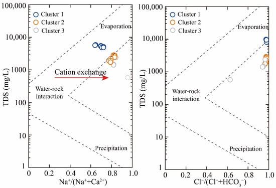 Ionic ratios serve as critical indicators for delineating hydrochemical processes in geothermal systems. Gibbs diagrams effectively differentiate dominant mechanisms such as evaporative function, rock–water interactions, and atmospheric precipitation [33]. As illustrated in Figure 5, geothermal groundwater samples exhibited Na⁺/(Na⁺+Ca2⁺) ratios ranging from 0.65 to 0.96, and Cl−/(Cl−+HCO3−) ratios ranging from 0.63 to 1.00. The samples clustered predominantly within the central region of the Gibbs diagram, suggesting that the water–rock interaction controls hydrochemical evolution. Furthermore, the large range of Na+/(Na++Ca2+) ratios in geothermal groundwater implies the occurrence of cation exchange interactions [15,30].