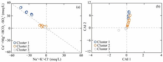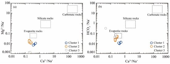The bivariate plots of Ca2⁺/Na⁺ versus Mg2⁺/Na⁺, and Ca2⁺/Na⁺ versus HCO₃−/Na⁺ reveal that geothermal water samples predominantly cluster within the evaporite rock domains (Figure 6). To further identify the principal source of ionic, the ionic ratios, including (Na⁺+K⁺)/Cl− and (Ca2⁺+Mg2⁺)/(HCO₃−+SO₄2−), were employed. As shown in Figure 7a, the ionic ratio of Na⁺/Cl− of Cluster 3 samples exhibited remarkable consistency with the 1:1 line, demonstrating that chloride ions in these clusters predominantly originate from the dissolution of evaporite minerals, specifically halite and sylvite. Furthermore, the (Ca2⁺+Mg2⁺)/(HCO₃−+SO₄2−) ratio served as an effective hydrochemical indicator for distinguishing weathering processes between carbonate minerals (calcite, dolomite, etc.) and sulfate minerals (gypsum, magnesium sulfates, etc.). Notably, Cluster 3 samples were distributed along the 1:1 line, indicating that the dissolution of carbonate and sulfate mineral is the principal source of Ca2⁺, Mg2⁺, HCO₃−, and SO₄2− (Figure 7b). However, Cluster 1 and Cluster 2 samples were characterized by the lowest ratio (Na++K−)/Cl− and the highest ratio of (Ca2++Mg2+)/(HCO3−+SO42−), suggesting that other hydrogeochemical processes influenced the ion equilibrium.