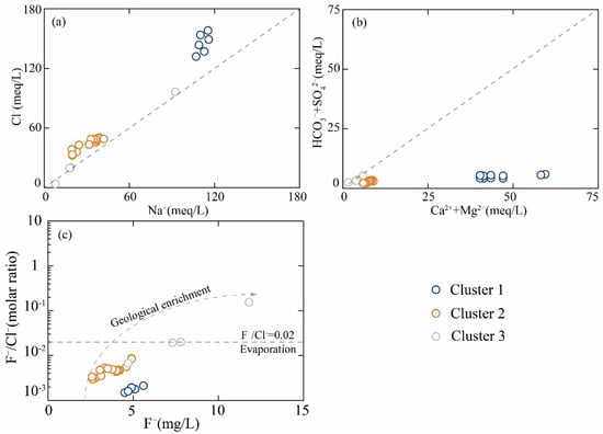 The ionic ratio of (a) Na+ vs. Cl−, (b) Ca2++Mg2+ vs. HCO3−+SO42−, and (c) F− vs. F−/Cl−.