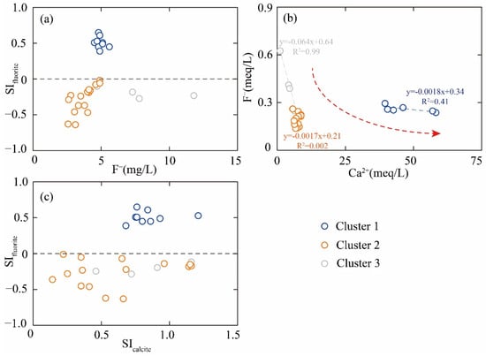 The saturation index (SI) is of vital significance, as it reflects the state of specific minerals within geothermal systems. In this study, the SI values for fluorite in Cluster 2 and Cluster 3 samples, calculated by the PHREEQC Version 3 software, were found to be below 0 (Figure 8a), revealing that fluorite is in an unsaturated state. This observation suggests that the elevated F− concentration in geothermal groundwater may stem from the dissolution of fluorite. Furthermore, a negative correlation between F− and Ca2⁺ was evident (Figure 8b), implying that an excess of Ca2⁺ might hinder the dissolution of fluorite. When compared to Cluster 1 and Cluster 2, Cluster 3 exhibited the lowest Ca2⁺ concentration and consequently the least inhibition of fluorite dissolution. This factor could potentially account for the highest F− concentration observed in Cluster 3 samples. Additionally, the SI value for calcite was found to be above 0 (Figure 8c), indicating that calcite is in a saturated or supersaturated state. The precipitation of calcite leads to a reduction in the Ca2⁺ concentration of geothermal groundwater, which, in turn, facilitates the dissolution of fluorite.