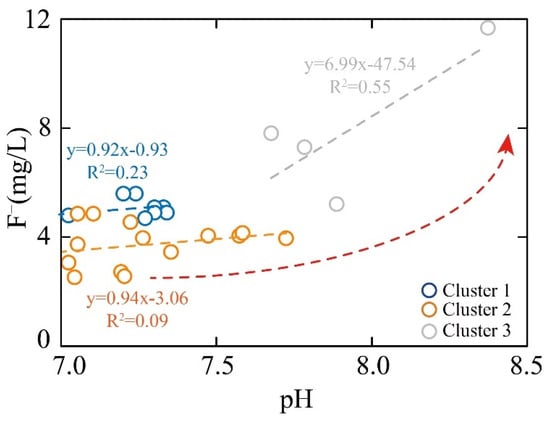 The solubility of fluoride in geothermal groundwater is significantly influenced by the pH value [30]. Specifically, the solubility of fluoride is minimized when the pH value is within the range of 5.0–6.5. In this study, the F− concentration in all geothermal samples increased with a rising pH (Figure 9). The pH values of Cluster 1, Cluster 2, and Cluster 3 were 6.77–7.34, 6.86–7.72, and 7.68–8.37, respectively. The F− concentrations of Cluster 2 and Cluster 3 samples showed relatively less sensitivity to pH variations. In contrast, the F− concentration was the highest in Cluster 3 samples, which exhibited the greatest sensitivity to the change inpH. The variation in F− concentration with pH could be attributed to the elevated concentration of OH−, which drives the chemical equilibrium of Equation (11) to shift to the right, thereby promoting the dissolution of CaF₂ [30]. Moreover, the similar ionic radii of F− and OH− facilitate the release of F− from fluorine-bearing minerals into geothermal groundwater through ion exchange interactions [29,30].