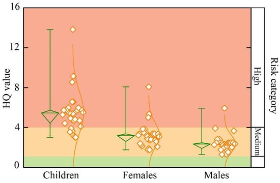 Fluoride-enriched geothermal groundwater may pose health risks to human health. The HHRA method was introduced to assess fluoride exposure risks in three groups: children, adult females, and adult males. The HITotal value is a key indicator of non-carcinogenic health effects, with values above 1 indicating significant health concerns needing intervention. As shown in Figure 11, the HITotal values for children range from 3.01 to 13.82, with an average value of 5.51. For adult females, the values are 1.76~8.08, with an average of 3.22. The HITotal value of adult males is from 1.29 to 5.93, averaging 2.36. The health risk order is children > adult females > adult males. Compared to adults, children are more susceptible to non-carcinogenic risks from fluoride-rich geothermal groundwater. This finding is consistent with the previous research results. The cause of this phenomenon may be due to children’s lower body weight and underdeveloped metabolism.