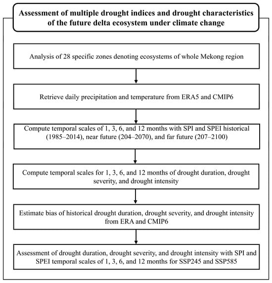 Figure 1 illustrates the process of assessing drought using multiple drought indices and temporal scales for the future of the Mekong’s ecological zones. The first step involves identifying these ecological zones. Then, precipitation and temperature data are collected from ERA5 and CMIP6 models. The SPI and SPEI drought indices are calculated for both the historical period (1985–2014) and the future (2041–2070) at 1-, 3-, 6-, and 12-month scales. Additionally, drought characteristics such as duration, severity, and intensity are computed. The discrepancies in drought characteristics are evaluated using CMIP6 and ERA5 data for the past. Future drought levels and trends are assessed using SPI and SPEI across the 1-, 3-, 6-, and 12-month temporal scales. The role of precipitation and evaporation in future drought assessment in the Mekong region will be presented in the discussion section.
