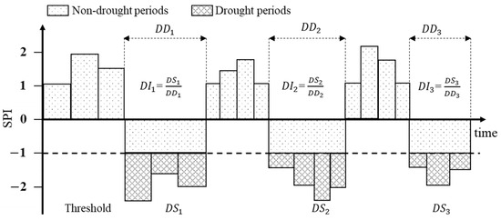 Drought characteristics included drought duration (DD), drought severity (DS), and drought intensity (DI).