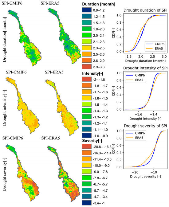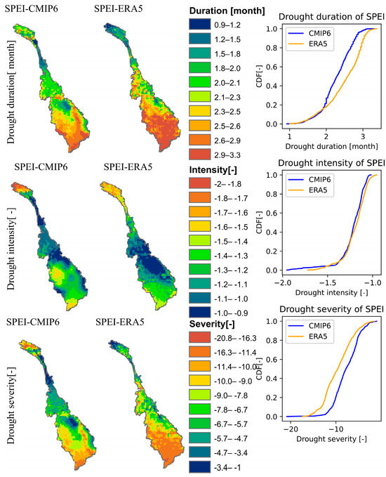 Figure 4 shows the spatial distribution of three key drought characteristics: duration, intensity, and severity, based on the SPI index. The northern region exhibits longer and more intense droughts (SPI below −2), while the central region shows shorter droughts with moderate intensity (SPI from −1 to −1.5). Meanwhile, the central region shows light yellow or orange colors, indicating shorter drought durations and moderate to severe intensity (SPI from −1 to −1.5). The southern region, if dark in color, also indicates severe droughts with major impacts on agriculture and livelihoods. Lighter colors in this region may indicate less severe conditions. In terms of the cumulative distribution curve (CDF), the image provides a quantitative assessment of the agreement between CMIP6 and ERA5 data. The horizontal axis represents the SPI index values, with values of −1 representing moderate drought and below −2 severe, while the vertical axis represents the cumulative probability. The close agreement between the CMIP6 CDF and ERA5 demonstrates the ability of CMIP6 to accurately reproduce drought conditions that occurred in the past.