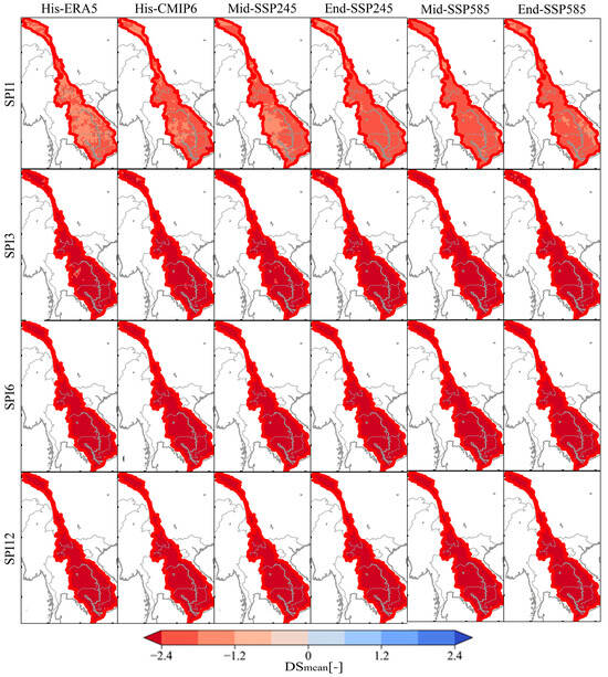 Figure 10 shows the severity of the SPI indices during the reference period (1985–2014), with short-term droughts being mostly insignificant, while the SPI1 and SPI3 indices indicate moderate to severe but not very severe impacts of meteorological drought. Meanwhile, the SPI3, SPI6, and SPI12 indices indicate increased severity, ranging from −2.4 to −1.8 over the entire study basin. In the future scenarios SSP245 and SSP585 in both future periods, the severity of droughts remains unchanged compared to the past period. The severity and duration of droughts based on SPI6 and SPI12 show a close relationship between the two, especially under the impact of the SSP585 scenario, which not only prolongs the duration of droughts but also increases the severity of droughts.