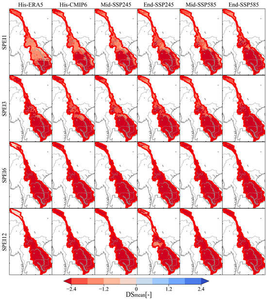 Global climate change has been posing serious challenges to water resources, with far-reaching impacts on the livelihoods of millions of people around the world (Gomez-Gomez, et al. [1,2,3]. The Mekong River Basin (MRB), one of the largest and most important river systems in Southeast Asia, is no exception to this trend. With a dense population and an economy heavily dependent on agriculture, fisheries, and freshwater resources, the region is particularly sensitive to climate impacts, especially drought [4]. In recent decades, the severity and frequency of droughts are projected to increase due to global warming and climate change [5]. Drought is one of the costliest natural disasters in the MRB [6,7]. Under the impact of climate change, drought conditions in the MRB are becoming increasingly severe, affecting the lives of communities residing in the basin, destroying their crops and fisheries, and causing food shortages due to reduced livelihoods. Before issues related to hydropower reservoirs, climate change, and changes in agricultural practices are appropriately addressed, accurately assessing future drought conditions to minimize damage and developing sustainable and effective water resource management strategies in the area are necessary as soon as possible.