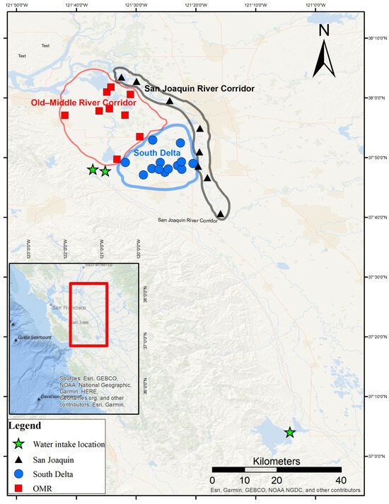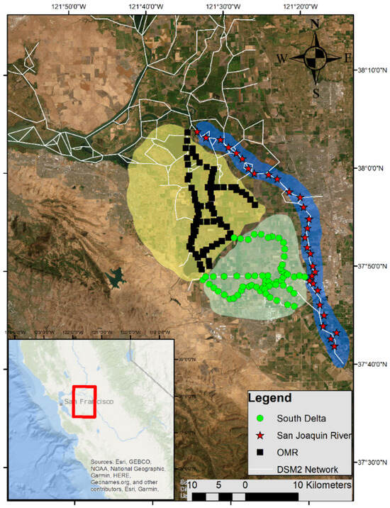 The Sacramento–San Joaquin Delta (Delta) serves as California’s most crucial water hub, where the state’s two largest rivers, Sacramento River and San Joaquin River, converge to form a 2978-square-kilometer (1150-square-mile) inland Delta and estuary system [1,2]. This vital water resource supports approximately 27 million people, irrigates 1.21 million hectares of farmland, and maintains a diverse ecosystem of over 750 species [3,4]. Beyond water conveyance, the Delta generates significant economic value through recreation, recreational fishing, and transportation activities.
