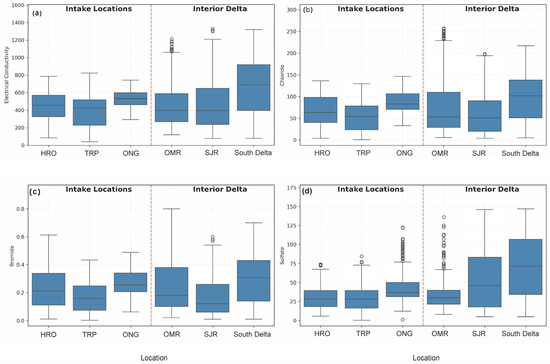 Distribution of (a) Electrical Conductivity, (b) chloride, (c) bromide, and (d) sulfate concentrations at water intake locations and Interior Delta monitoring stations. Red dashed line separates intake locations (left) from Interior Delta locations (right).