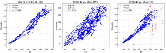Data preprocessing and quality control were crucial steps to ensure model reliability. We implemented a regression-based outlier detection method focusing on the fundamental relationship between EC and ion constituents, where points exceeding three standard deviations from the regression line were flagged as potential outliers. This analysis revealed minimal outliers across locations, as detailed in Table 1, with outlier percentages generally less than 3% across all constituents and locations. The strong coefficient of determination (R2) values, particularly for chloride (0.928 at HRO, 0.688 at ONG, and 0.823 at TRP), indicated high data quality and validated our outlier detection approach. Figure 3 illustrates the relationship between EC and chloride concentrations at the three water intake locations, demonstrating both the effectiveness of our outlier detection method and the varying relationships at different locations.