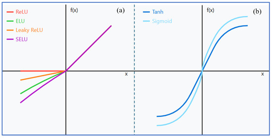 - Activation functions (ReLU, tanh, ELU, SELU, Leaky ReLU, and sigmoid) (Equations (1)–(6)).