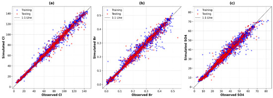 To further assess model stability and generalization capabilities, we implemented a k-fold cross-validation analysis (k = 5). This approach systematically partitions the data into five equal folds, using four folds for training and one for testing, rotating through all possible combinations. We maintained consistent preprocessing across all folds using Scikit-learn’s ColumnTransformer, which included standardization of numerical features (EC, X2) and one-hot encoding of categorical variables (Location, WYT, Month). For each fold, we loaded the previously trained models and preprocessors for each ion constituent, then evaluated their performance using the three metrics mentioned above (R2, MAE, and PBIAS). This cross-validation implementation was performed independently for each ion constituent (chloride, bromide, and sulfate), allowing us to assess the stability of model performance across different subsets of data and different constituents. The analysis was automated using the TensorFlow and Scikit-learn libraries, ensuring consistent evaluation procedures across all folds and constituents. This systematic approach provides a more reliable estimate of model performance than single train-test splits, which was particularly important given the temporal and spatial variability in our water quality data.