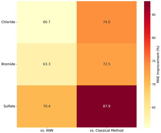 The superior performance of our location-specific ANN models compared to both the Interior Delta ML model and classical methods highlights several important considerations in water quality modeling. The substantial improvements in Mean Absolute Error (MAE)—ranging from 24% for TDS to 59% for sulfate—demonstrate that tailoring models to specific monitoring locations can significantly enhance prediction accuracy. This improvement likely stems from the models’ ability to capture location-specific relationships between Electrical Conductivity and ion constituents, which vary considerably across the Delta system.