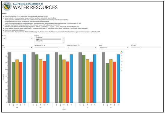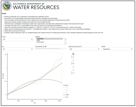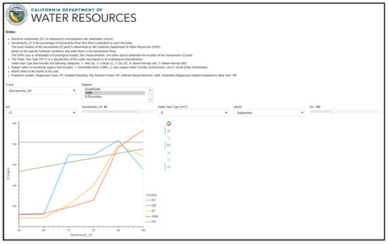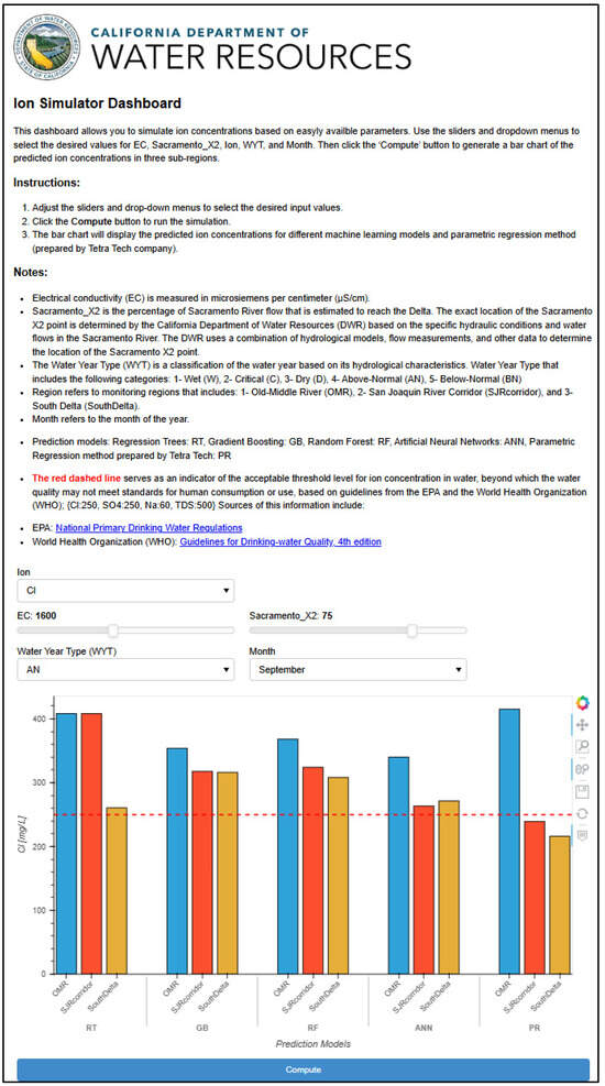 The Enhanced Interior Delta Dashboard extends our previous Interior Delta dashboard [25] by integrating Hutton et al.’s parametric regression equations alongside machine learning predictions [21]. This integration enables direct comparisons between four machine learning approaches—Regression Trees (RTs), Gradient Boosting (GB), Random Forest (RF), and Artificial Neural Networks (ANNs)—and the classical parametric method across three sub-regions. The dashboard also includes horizontal threshold lines for key ion constituents (chloride: 250 mg/L, sulfate: 250 mg/L, sodium: 60 mg/L, and total dissolved solids: 500 mg/L), allowing users to quickly identify when predicted concentrations exceed acceptable water quality standards [45].