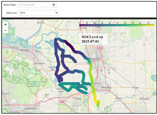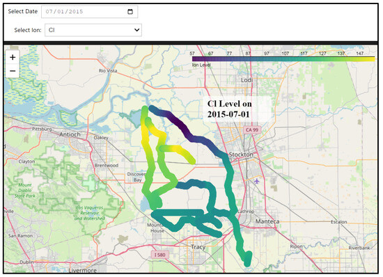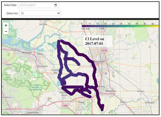 Figure 13 demonstrates the dashboard’s visualization capabilities through a bromide concentration map for 1 July 2015. The interface features a date selector and ion constituent dropdown menu, allowing users to explore temporal and chemical variations across the Delta. The example reveals distinct spatial patterns in bromide concentrations, with values ranging from 0.17 to 0.51 mg/L. A clear gradient is visible from the northern Delta (higher concentrations shown in purple/blue) to the southern regions (lower concentrations in green/yellow), reflecting the complex interplay of tidal influences and river inflows.