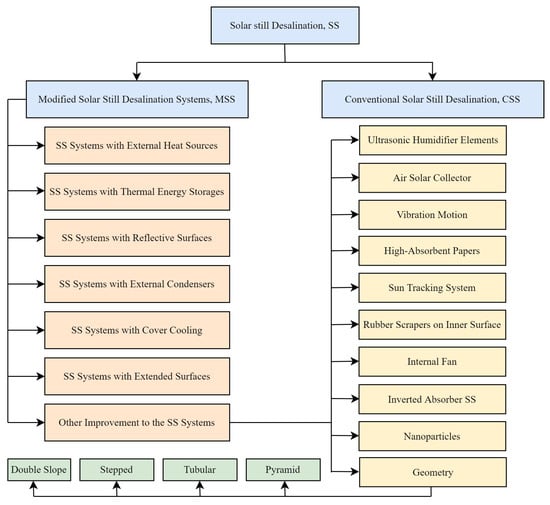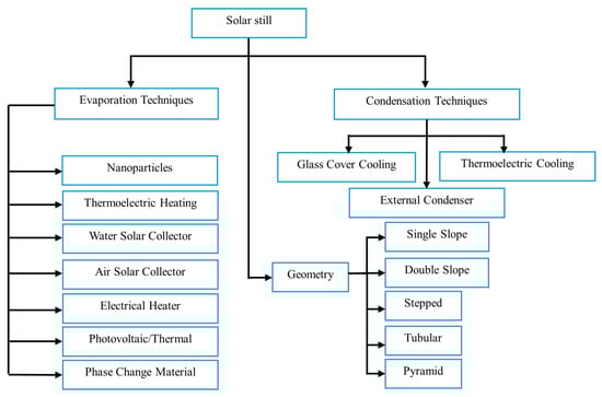 Additionally, the review emphasizes the importance of future research that involves the integration of different techniques within solar stills, providing a roadmap for ongoing advancements in the field. Classification of modification types to boost productivity in a solar still is depicted in Figure 2.