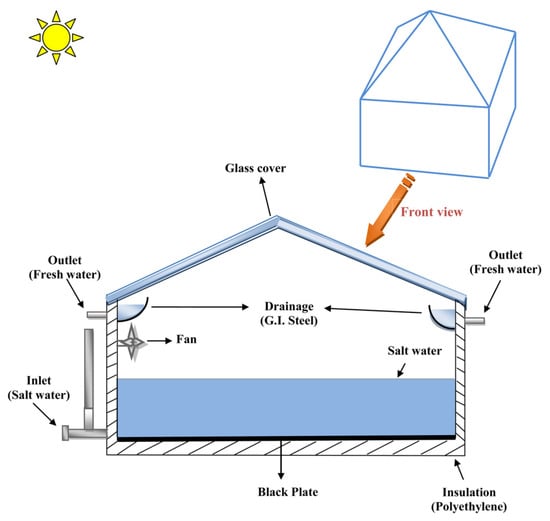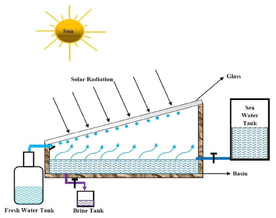 The conventional solar still (SS) system is recognized as a standard and widely employed method for solar desalination without any adjustments or modifications. Various researchers have investigated these conventional SS systems to gain insights into their operational principles and the influence of environmental conditions, design, and operational factors on their efficiency. The solar still desalination system is characterized by its simplicity, affordability, and minimal maintenance requirements. It primarily consists of a basin that is blackened and topped with sloping transparent covers. The operational mechanism of the SS system is straightforward, relying on the principles of evaporation, condensation, and gravity. Solar energy is absorbed by a blackened basin, which blackens the brackish (or saline) water within it, leading to a rise in the temperature of the water and the subsequent evaporation of water vapor. This vapor then condenses on the sloping cover, allowing fresh water to collect and drip into a drainage channel. An illustrative representation of a CSS system is provided in Figure 3 [28].