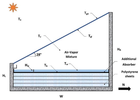 Jamil and Akhtar [30] conducted an experimental study to examine the impact of the distance between the blackened basin and the cover surface in a single-slope solar still (SS). The stationary designing parameters included basin dimensions of (0.7 × 1.4) m, a cover inclination angle of 28° (corresponding to the site’s latitude), and a water depth of 10 mm. They manipulated the gap height between the blackened basin and surface of the cover, which is achieved using sheets of polystyrene, achieving distances ranging from 0.266 m to 0.366 m. Their results indicated that a smaller void between the basin and the surface of the cover significantly enhances the productivity of the SS system. Specifically, the rate of daily productivity varied between known values from (1.341 to 4.186) L/m², while the rate of efficiency per day was regulated at 11.25 to 39.59%. Additionally, the produced water cost fluctuated between 0.074 USD/L and 0.024 USD/L. A graphic diagram of the experiential setup is presented in Figure 5.