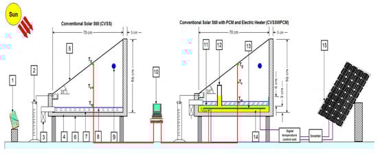 An important advancement in solar still (SS) systems involves the integration of an additional heat source with the traditional setup. Researchers have explored various methods to increase the water productivity of SS by increasing the evaporation rate. This is often achieved by incorporating a heat exchanger. The brackish (saline) water in the blackened basin was warmed by the heat exchanger, or the feed water, before it entered the SS system. Potential external heat sources include solar collectors, solar ponds, or waste heat from sources such as engine exhaust systems. In their 2023 study, Abdel-Aziz et al. [31] conducted experimental tests to enhance the single-sided solar still performance by integrating paraffin wax (PCM) with an electric heater powered by solar energy. Two identical single-sided solar stills were constructed and examined under similar climatic conditions in Al-Arish, Egypt, from the spring to the summer of 2021. One setup functioned as a CVSS, while the other incorporated both PCM and a heater that worked by electric ity (CVSSWPCM), as shown in Figure 6.