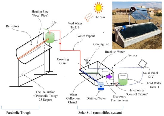Schematic representation of the modified solar still integrated with a parabolic trough and feedwater tank. Reprinted from Ref. [32]. Copyright 2021, Aqlan et al. Licensed under CC BY 4.0.
