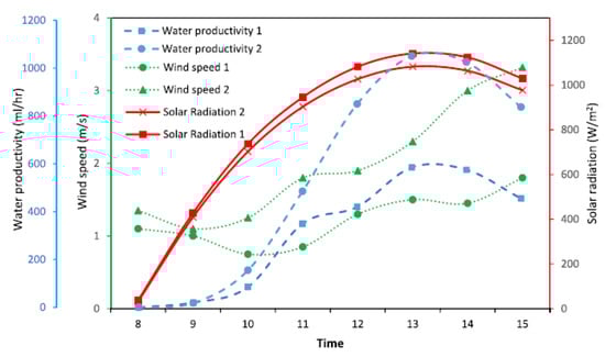 Solar radiation per hour, wind speed, and productivity for CSS and MSS. Reprinted from Ref. [32]. Copyright 2021, Aqlan et al. Licensed under CC BY 4.0.