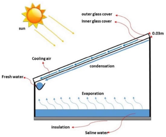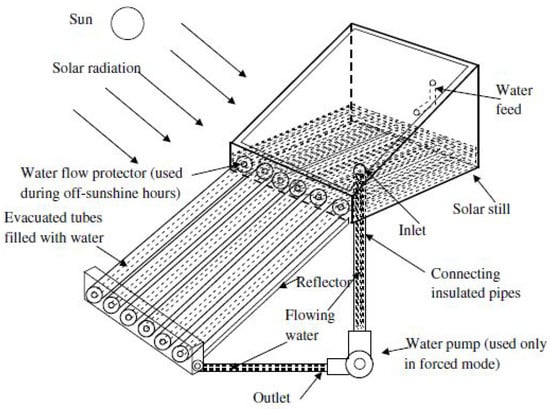 Schematic Representation of a single-sided solar still integrated with a vacuum tube solar collector for preheating brackish water. Reprinted with permission from Ref. [33]. Copyright 2014, Elsevier.