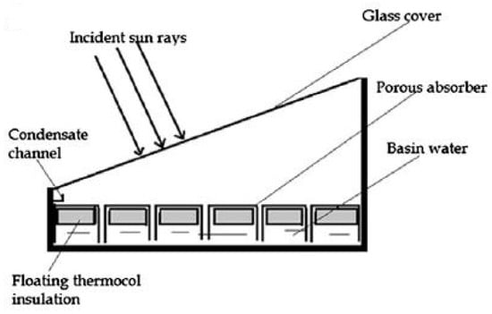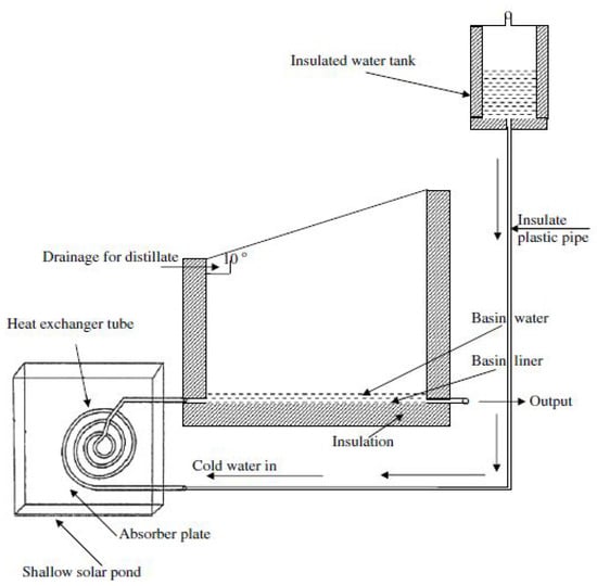 Schematic Representation of a Solar Still System Integrated with a Shallow Solar Pond and Tube-Based Heat Exchanger for Preheating Brackish Water. Reprinted with permission from Ref. [36]. Copyright 2008, Elsevier.